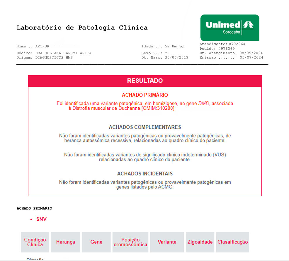 O exame de Exoma Completo confirmou a mutação no gene MFSD8, responsável pela CLN7 (Lipofuscinose Ceróide Neuronal Tipo 7). Esse laudo genético é a principal evidência científica do diagnóstico, validando a condição da Arthur e a necessidade urgente do medicamento.